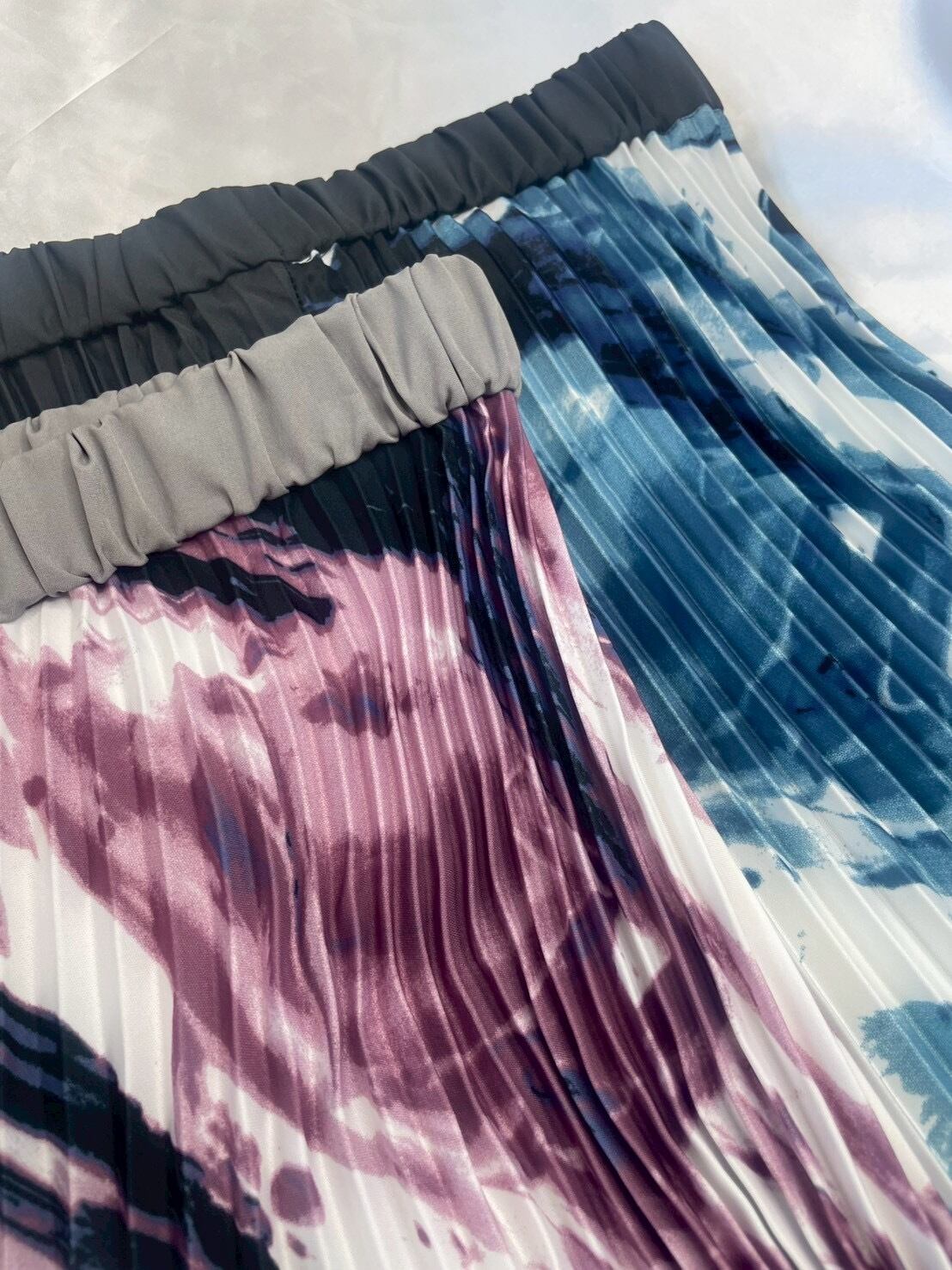 スタイリングにプリントデザインが華やかさをプラスするプリーツパンツ。大胆なバイカラーがモードな印象になり、プレスの効いたプリーツで着痩せ効果も◎