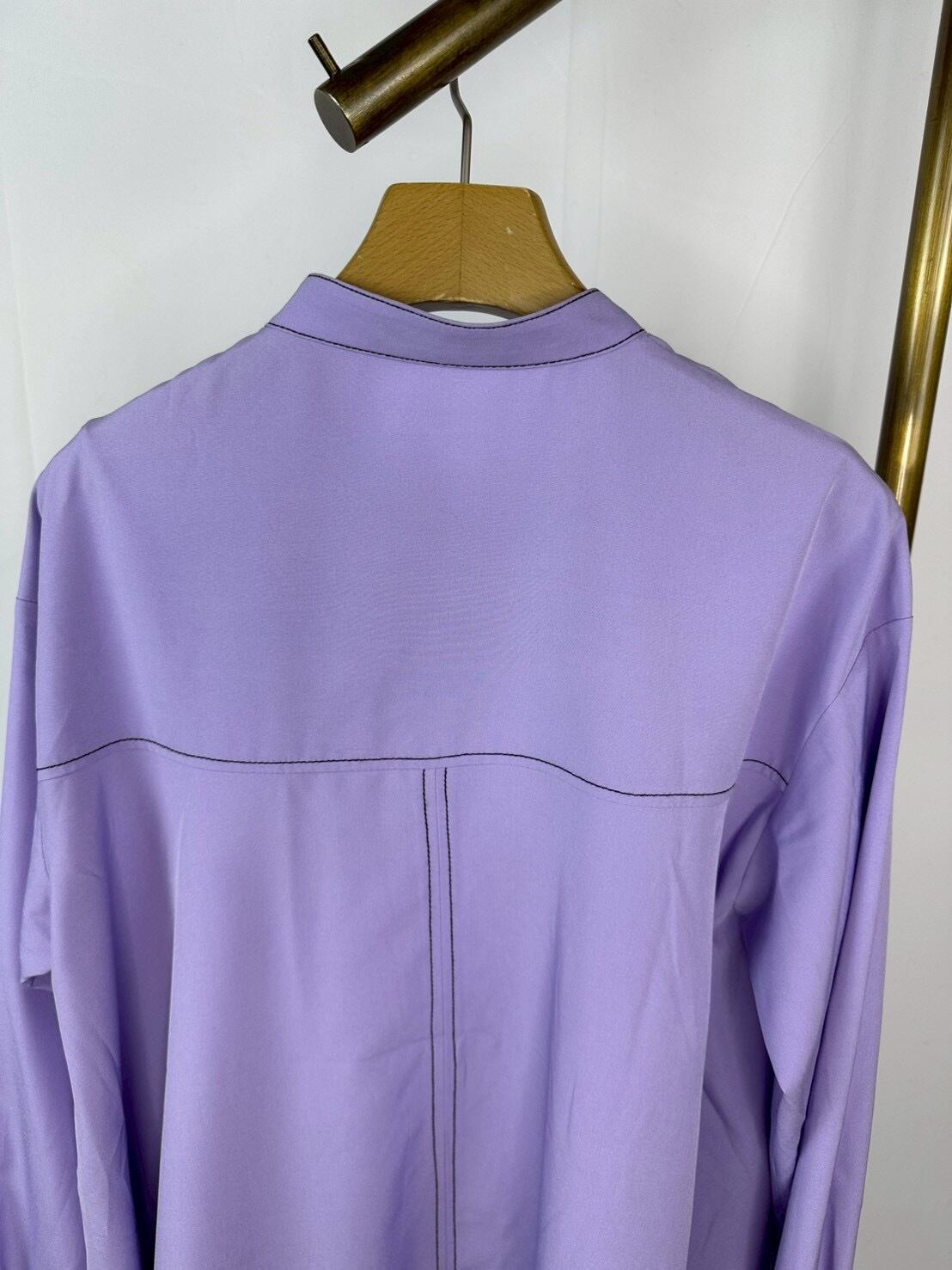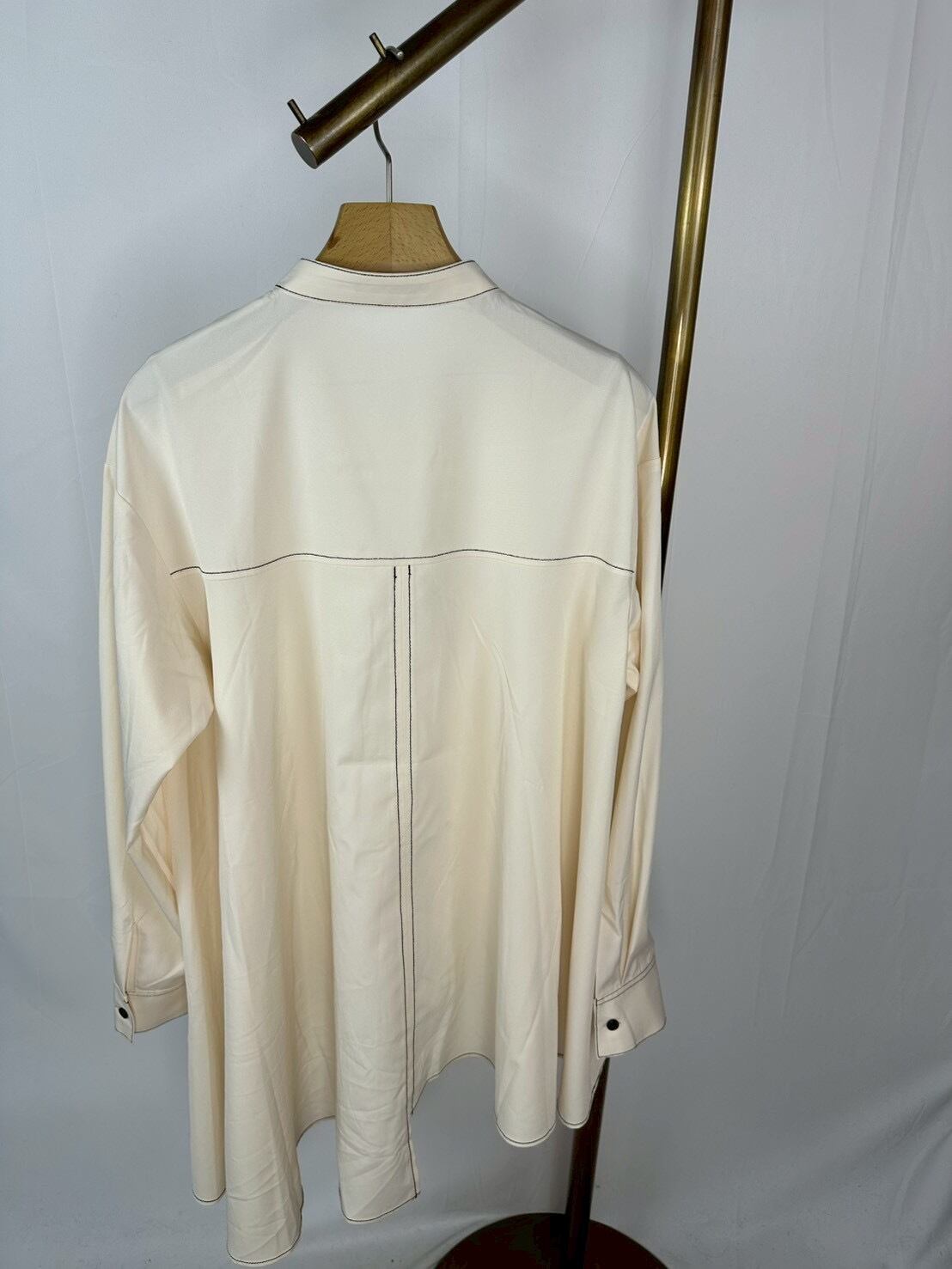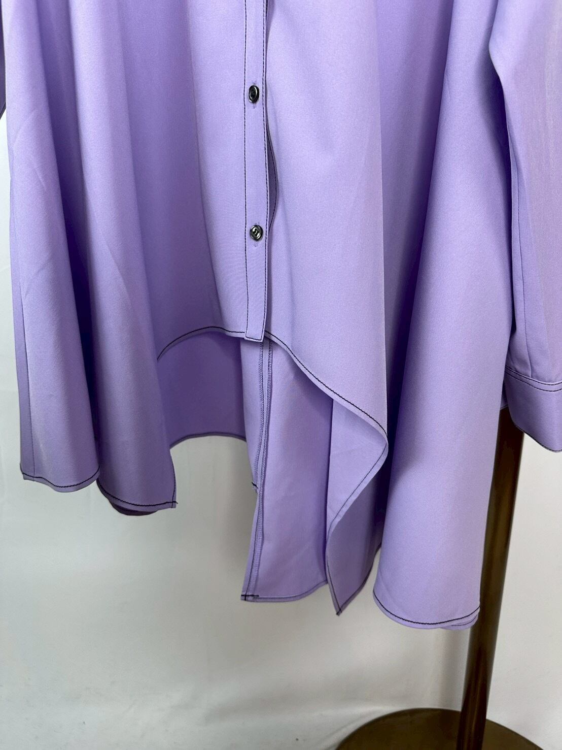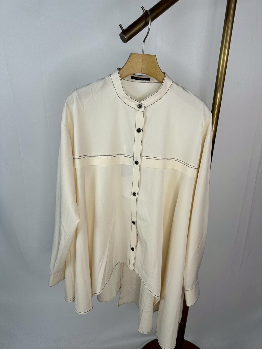 女性らしいフレアシルエットのブラウスにステッチがアクセントになったデザイン。独創的なヘムラインはレイヤード時のポイントにもなり、長いシーズンで楽しめるアイテム。