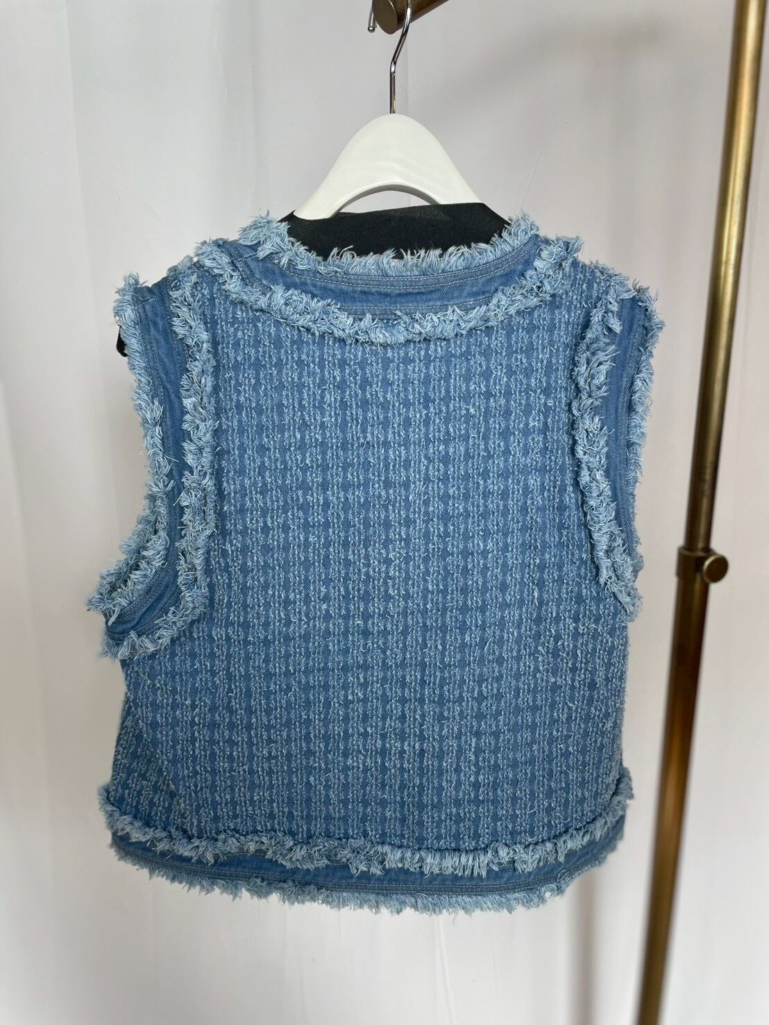 ツイードとデニムが合わさった新鮮なデザインベスト。コンパクトなサイズ感で合わせやすく金釦がアクセントに◎デニムにツイードが合わさることで綺麗めスタイルにも取り入れやすいデザイン♪