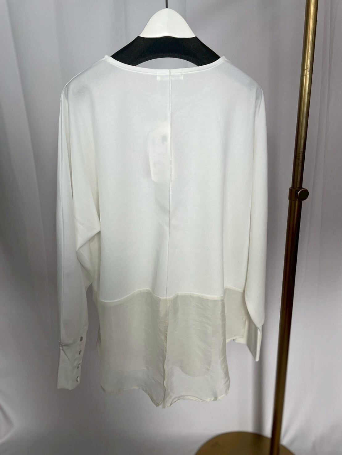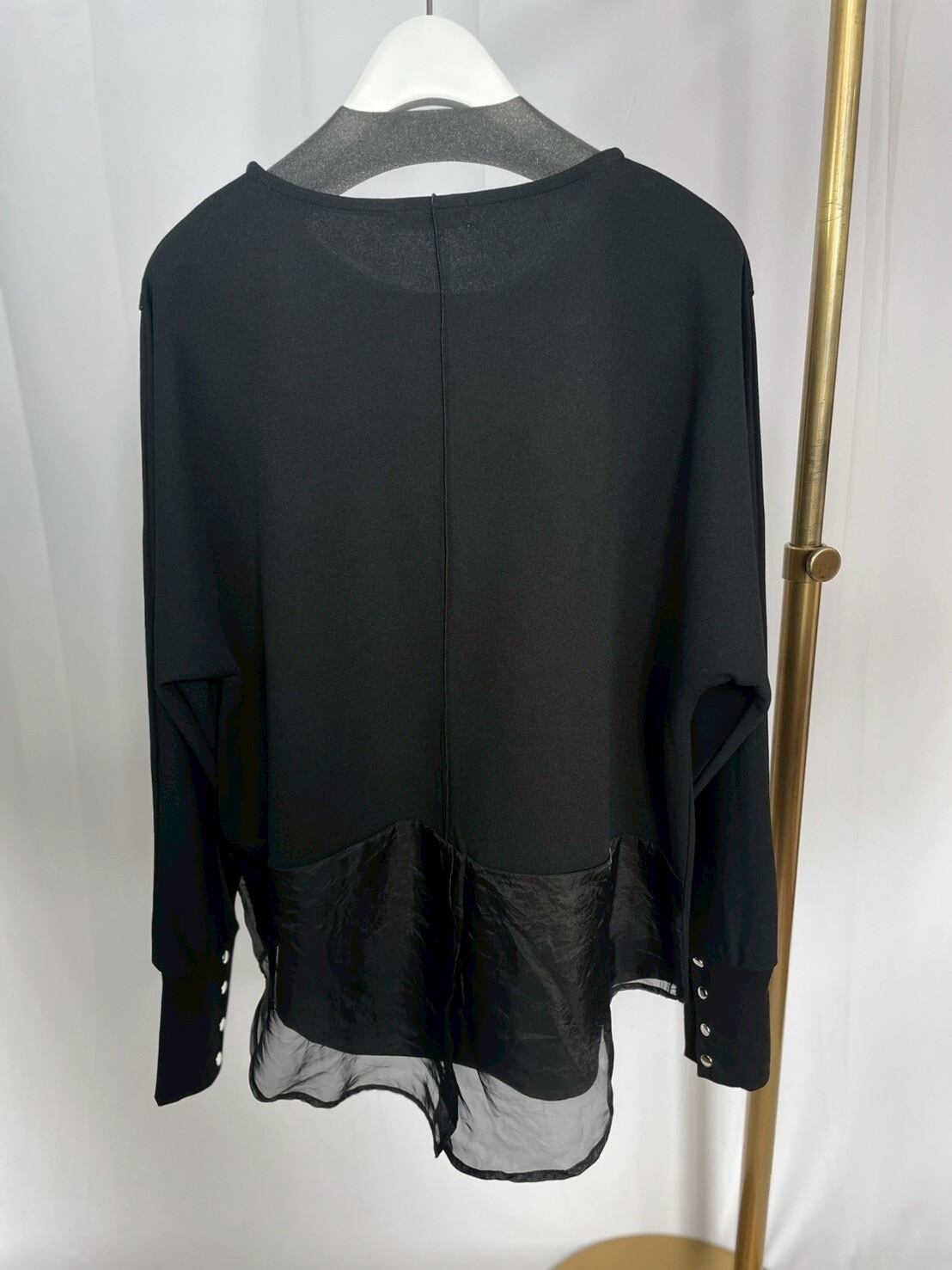 後ろ身の素材切替がポイントのオーガンジーブラウス。程よい透け感のあるデザインが女性らしさを引き立ててくれます♡袖釦もちょっとしたアクセントに◎