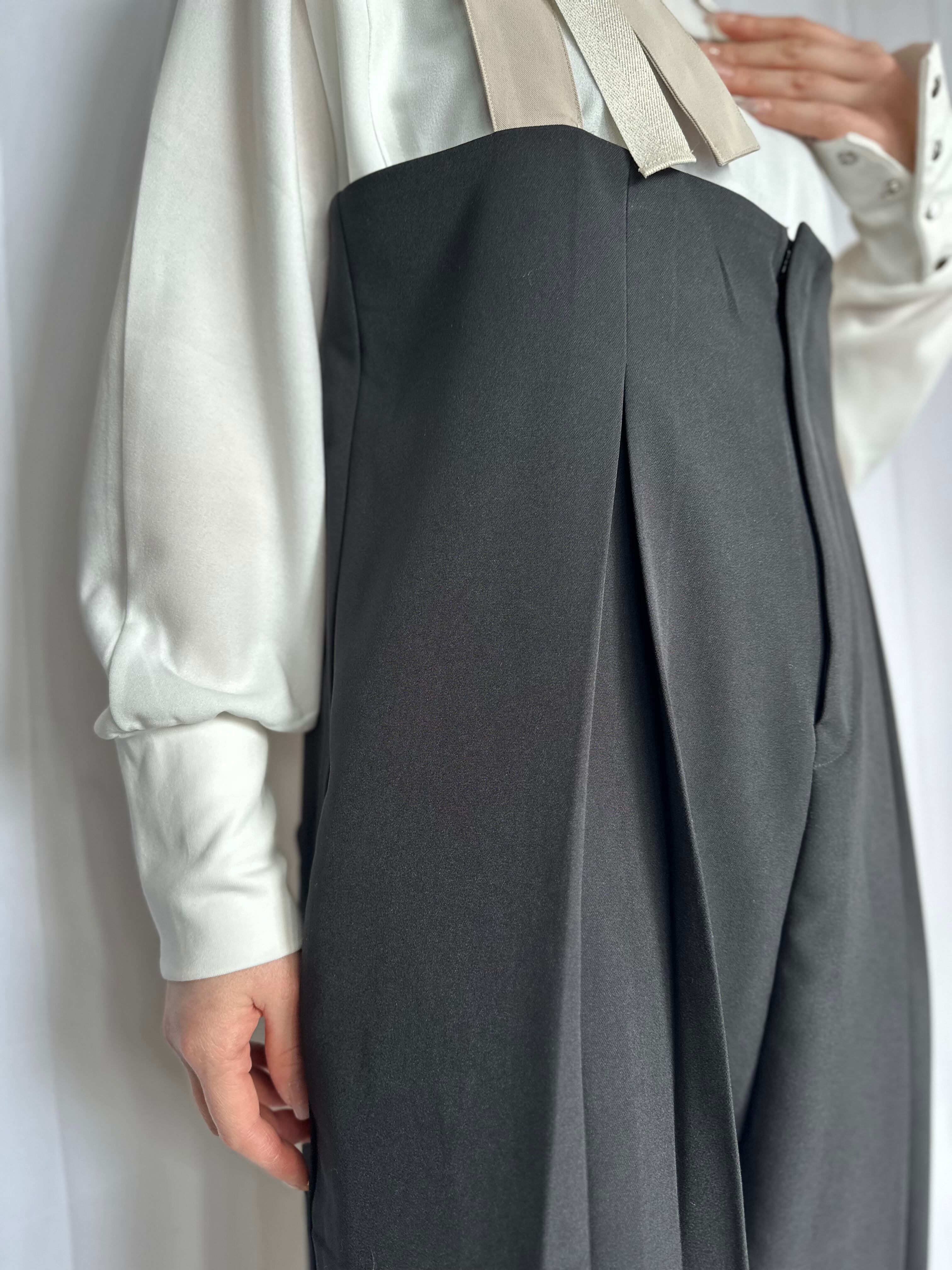 肩紐のギャザーディティールと長めに垂らしたラメテープがポイントの綺麗めサロペット。裾まで入ったセンタータックが細見え効果抜群◎肩紐は長さ調節可能なので、幅広い身長の方にご着用いただけます。