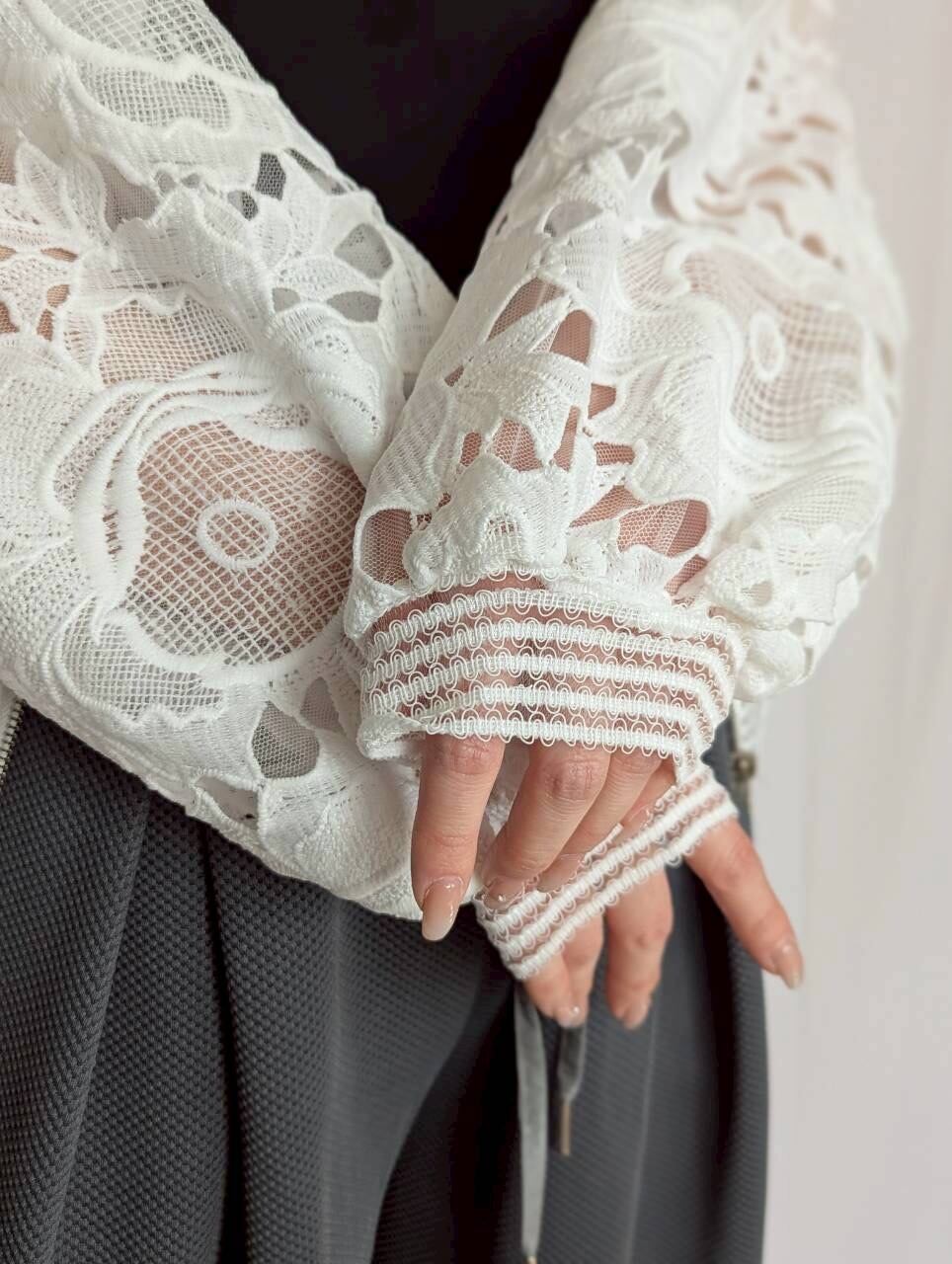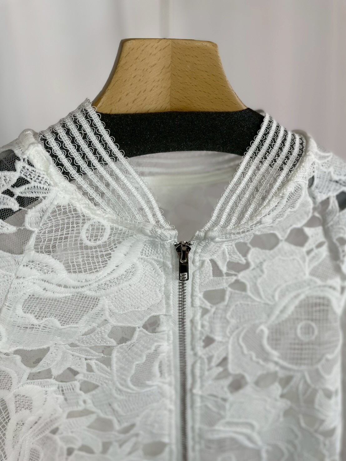 上品なレースが施された綺麗めブルゾン。パンツ・スカートどちらとも合わせやすく、ワンピースやサロペットの羽織にも◎軽やかな着心地で春から夏にかけて重宝する1着です♪