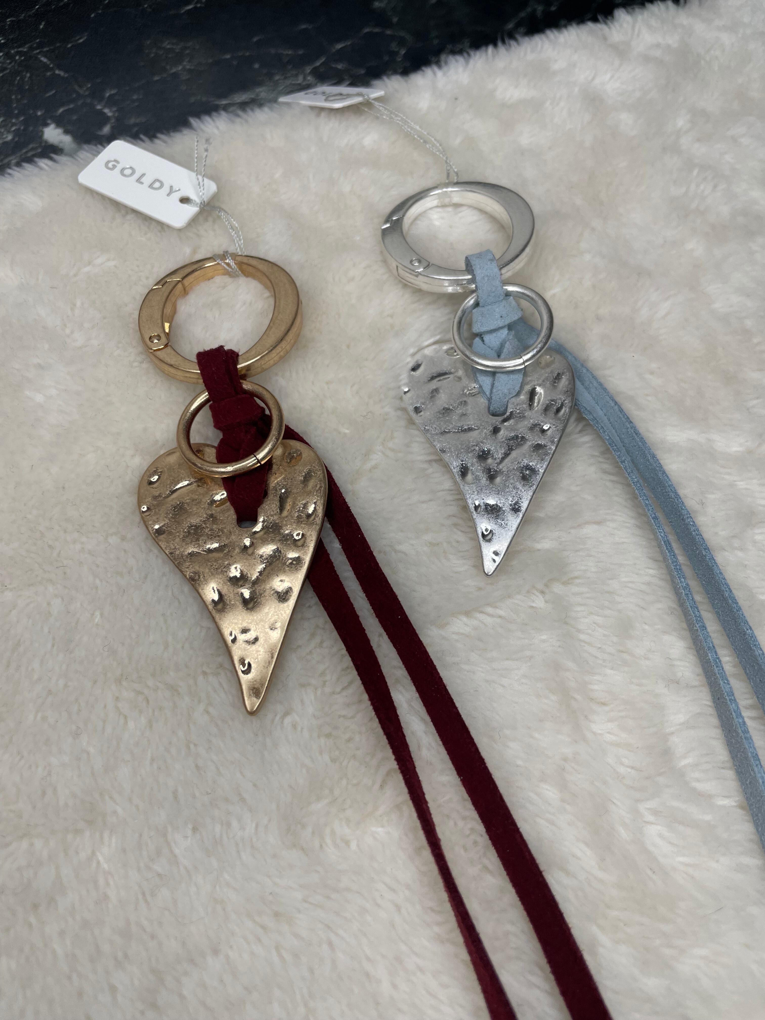メタル素材のハートモチーフとスウェード調のコードを組み合わせたチャーム。バック・キーチャームはもちろん、ベルトループに付けてコーディネートに取り入れるのもおすすめ◎