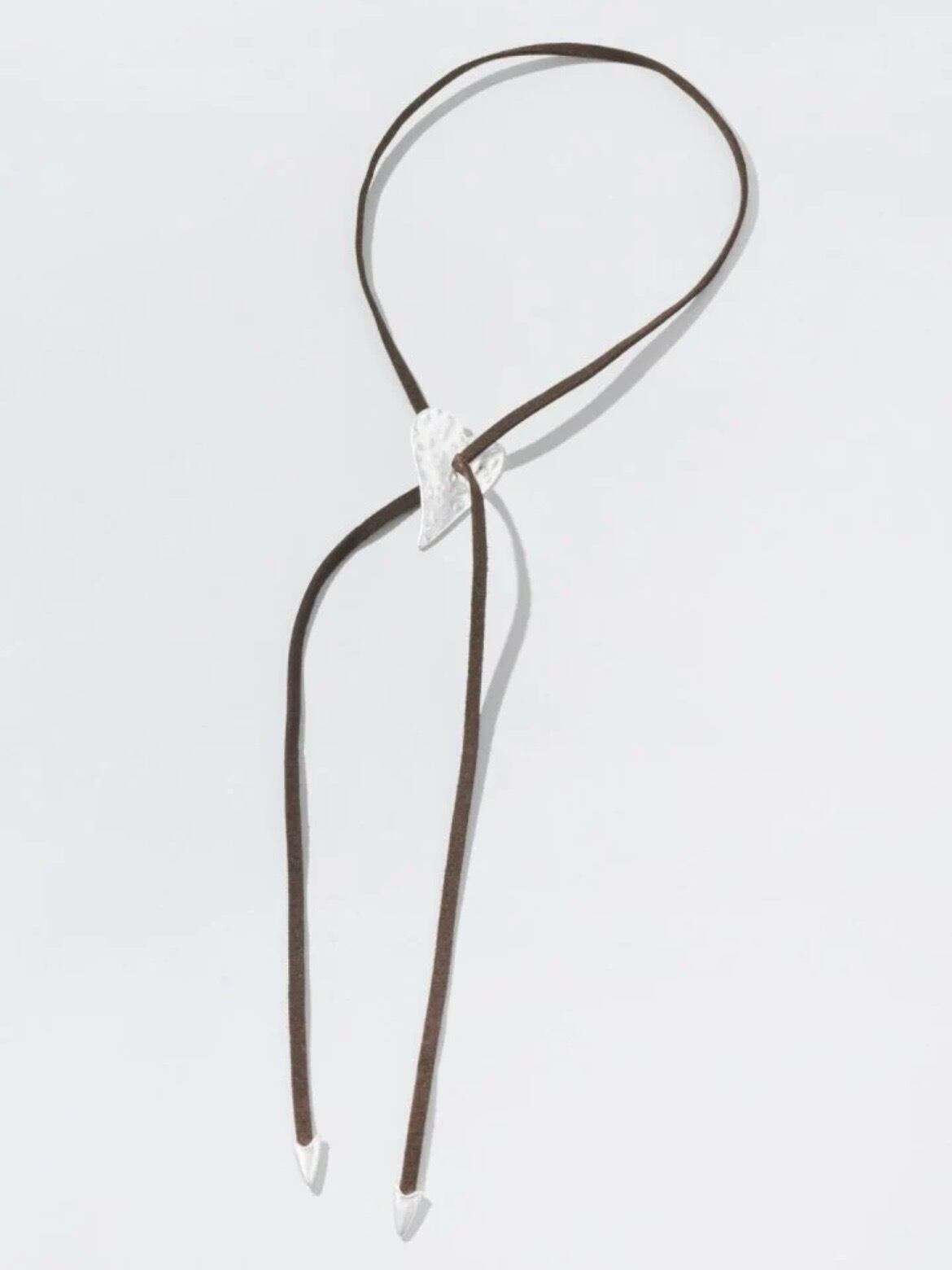スウェード調のコードにメタル素材のハートモチーフを組み合わせたトレンド感のあるデザイン。前で結ぶスタイルはもちろん、首に巻いてチョーカーのようにしたりそのまま結ばずに垂らしたりと気分やコーディネートに合わせて楽しめます♪