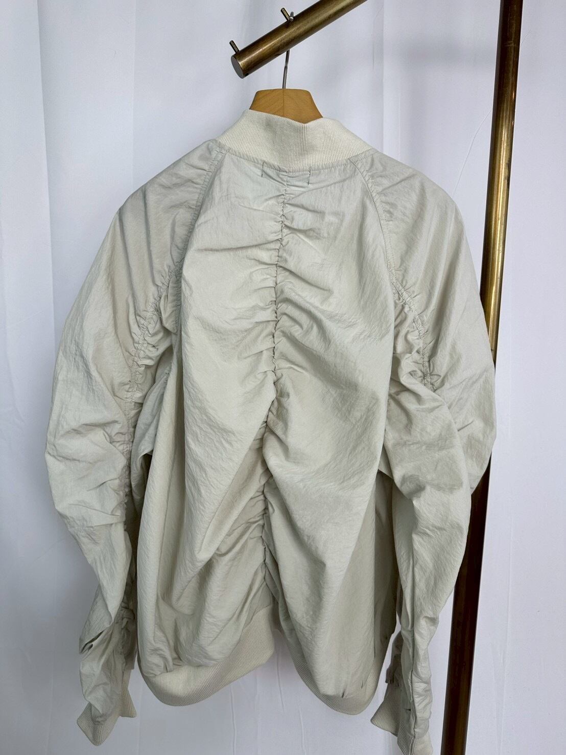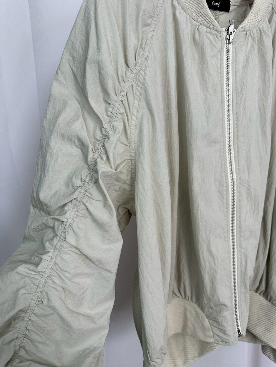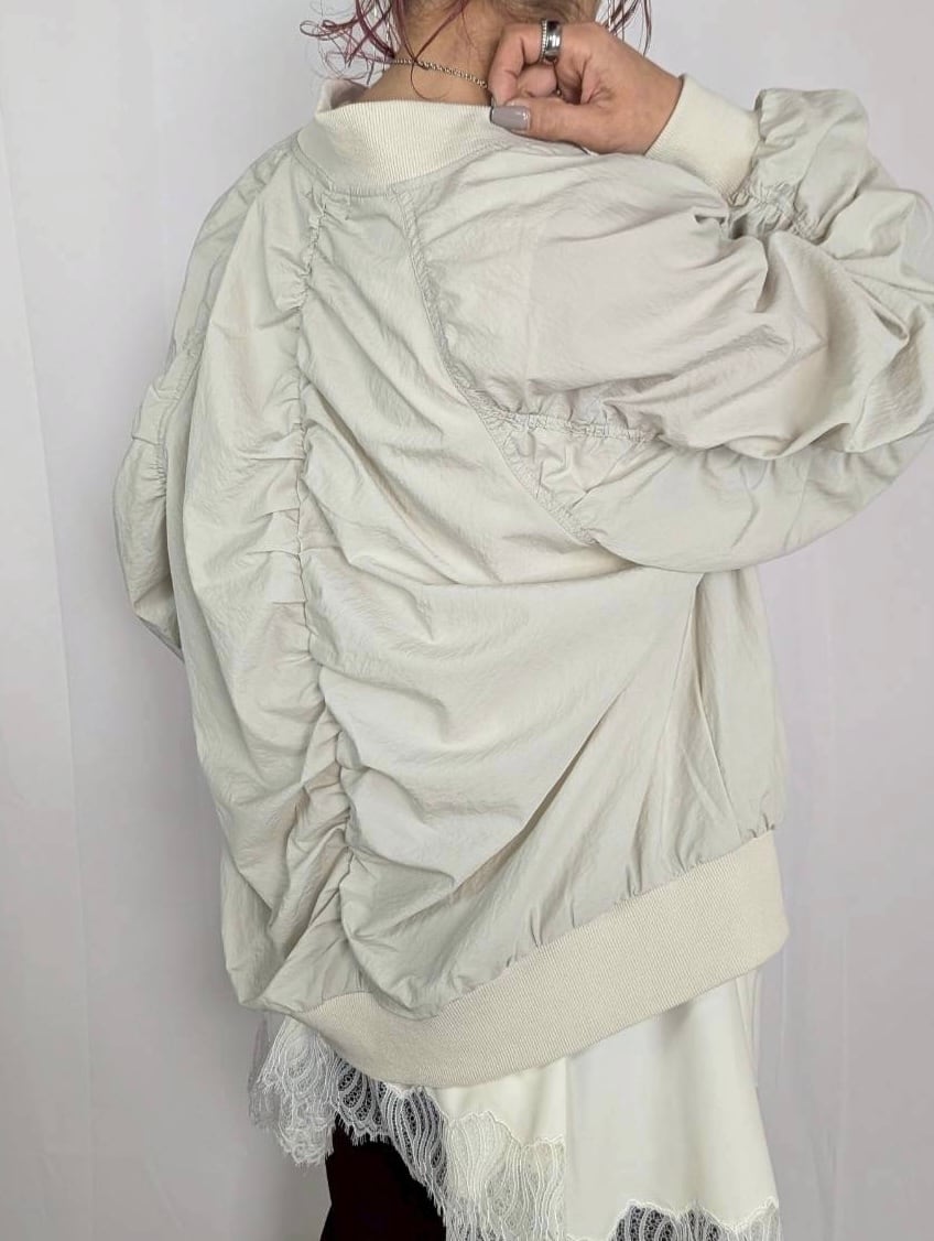 たっぷりのギャザーを施したブルゾンはワークムードの中にも少し甘さを忍ばせたデザイン。軽い着心地でストレスフリー。首周りと袖口がリブになっていてワンポイントに◎