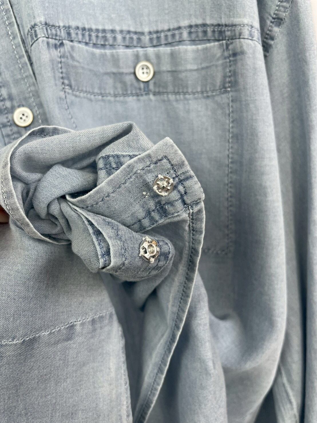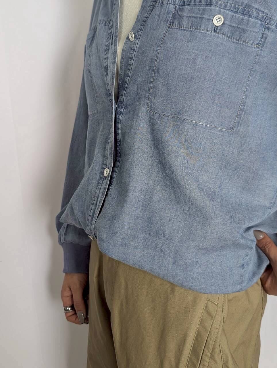 昨年大人気アイテムが今年も登場!シアーデニムのような薄い生地で夏場の羽織にもできる1枚。1枚はもちろん、Tシャツとのレイヤードスタイルもおすすめ♪内側のスナップボタンで前身の丈感調節が可能◎