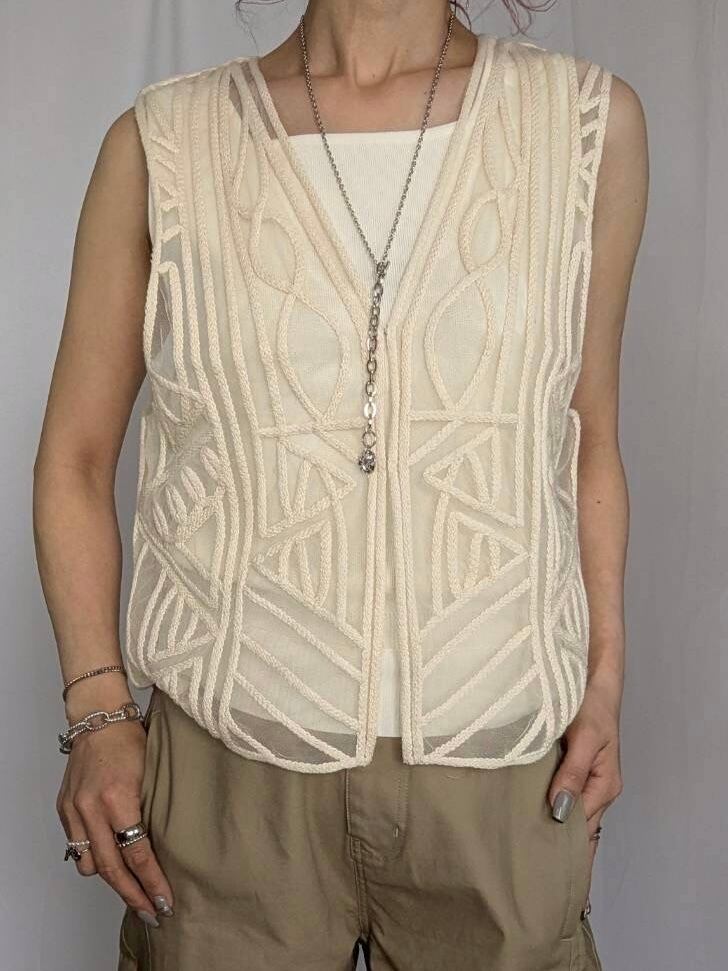 幾何学をモチーフとした刺繍デザインがコーデに抜け感をプラス。インナー次第でロングシーズン着用していただけます。ジャケットの下にプラスワンアイテムとしての着用や、デニムと合わせてカジュアルに着こなすのもおすすめ◎