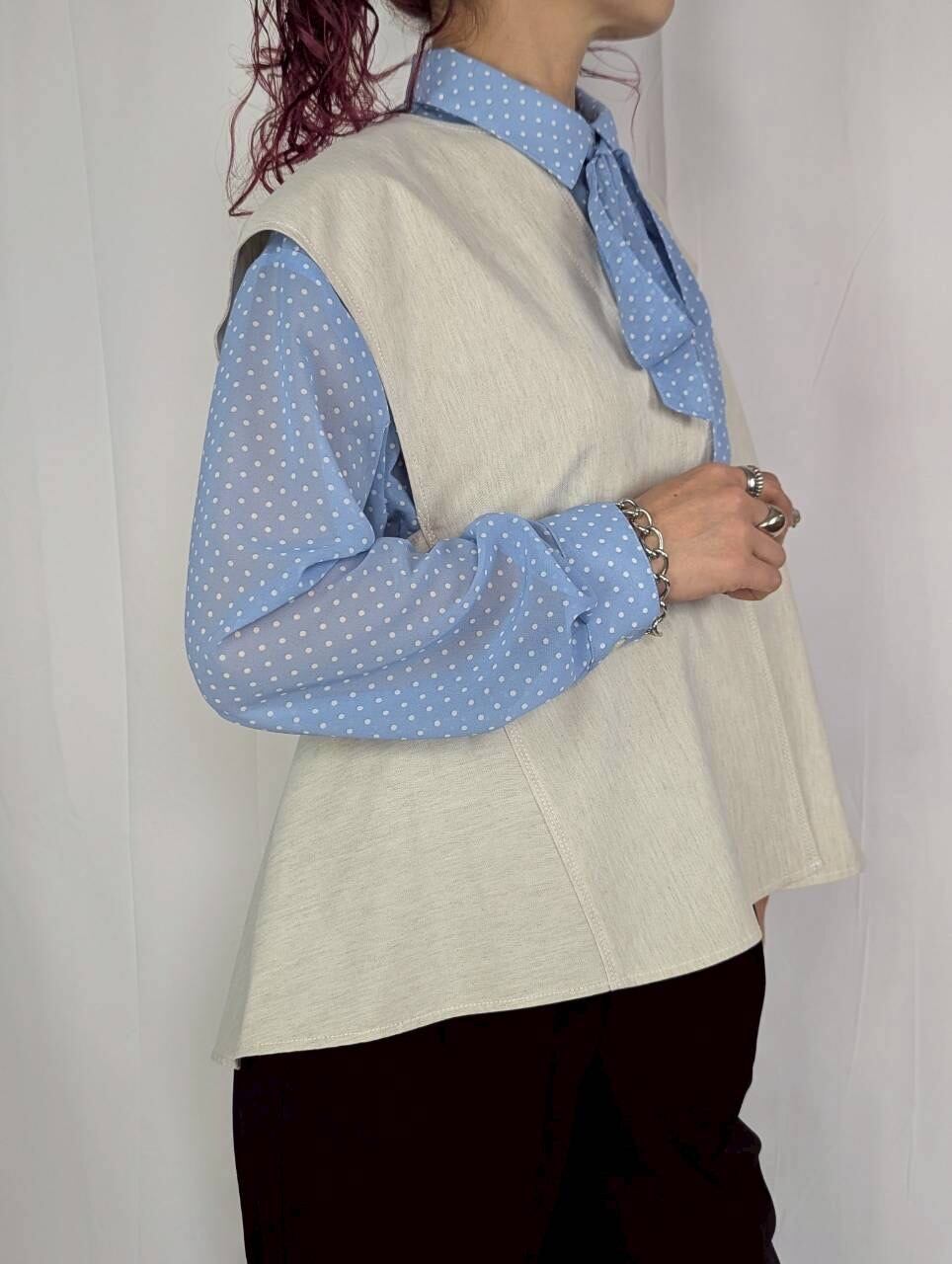 後ろから見たシルエットが女性らしいリネン混ベスト。リネン+綿の程よくハリ感のある生地でカジュアル・綺麗めどちらにも取り入れやすい。後ろ身頃が長めになっているのでお尻周りのカバー◎パンツはもちろん、タイトスカートと合わせてより女性らしく着こなすのもおすすめです♪