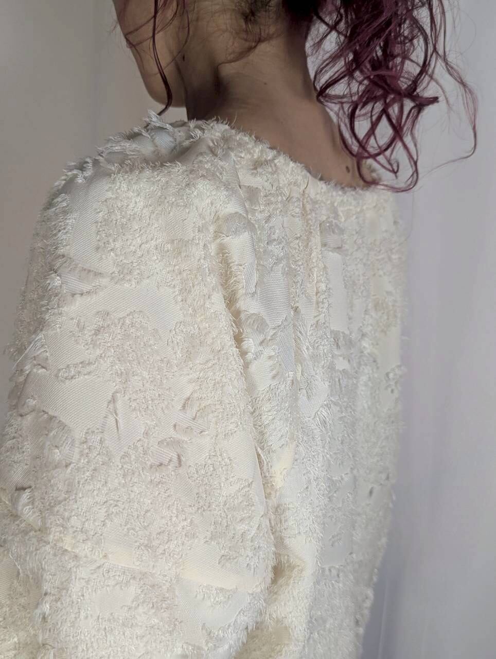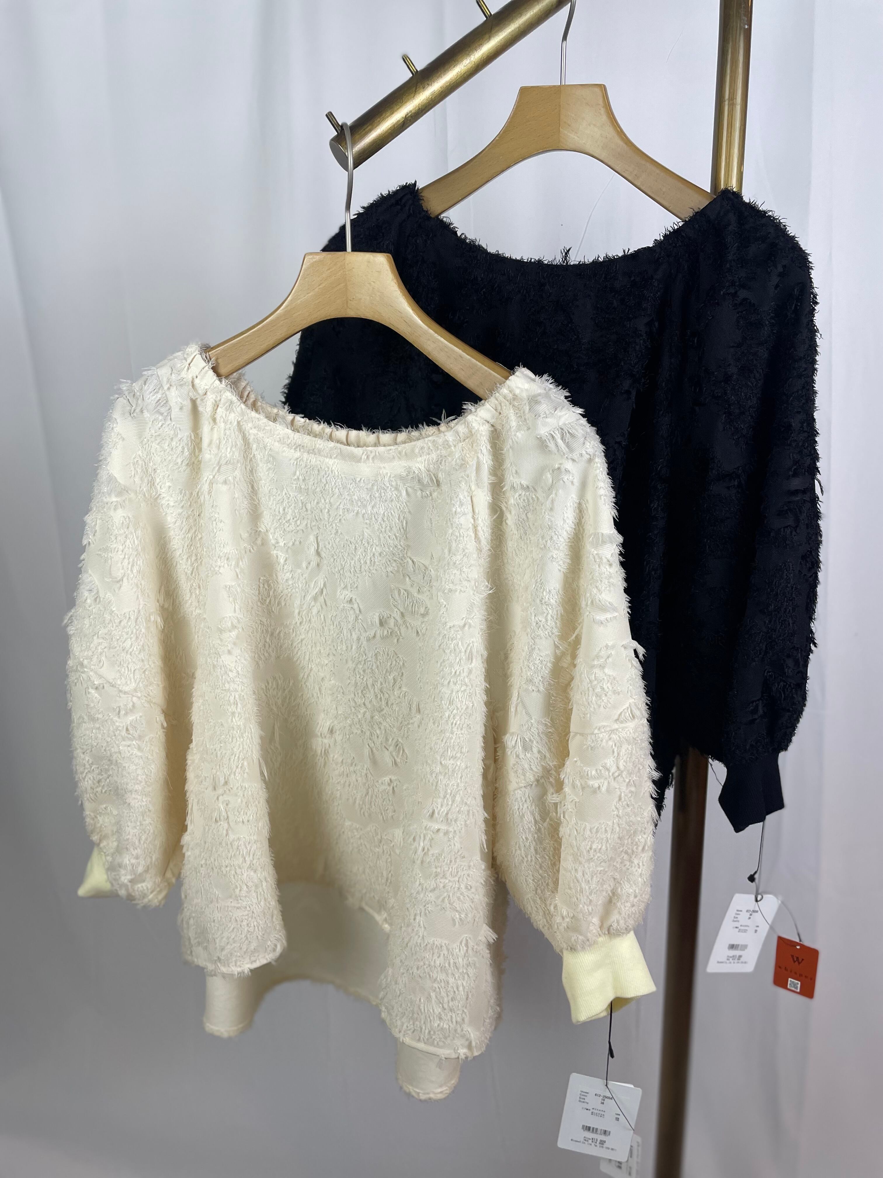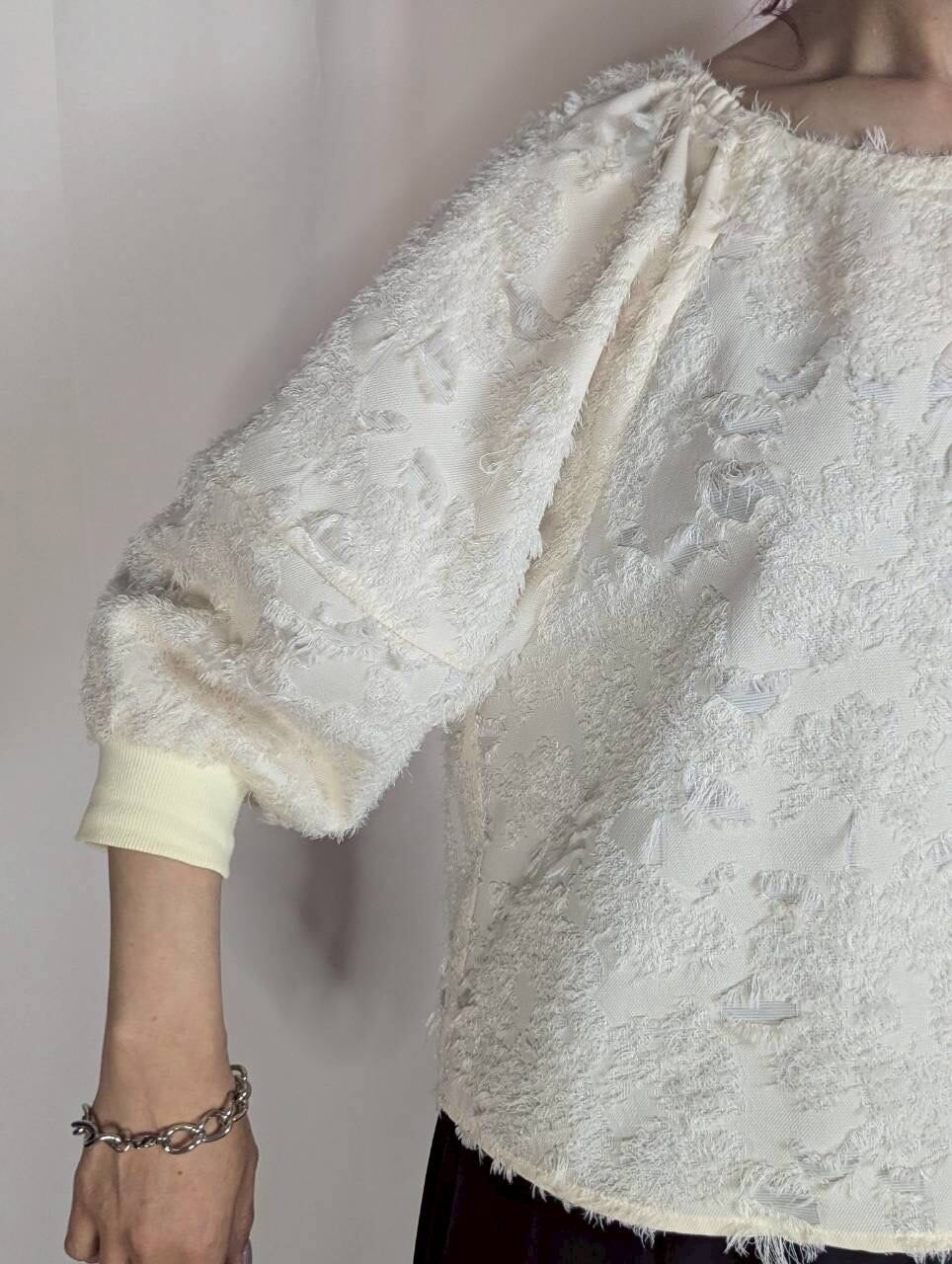 ぽわんと膨らむボリューム袖が女性らしく華やかな印象のジャガードトップス。毛足の短いフリンジの表面感が大人可愛く1枚で着映えするアイテム。ゆったりとしたサイズ感と前後差で体型カバーも◎