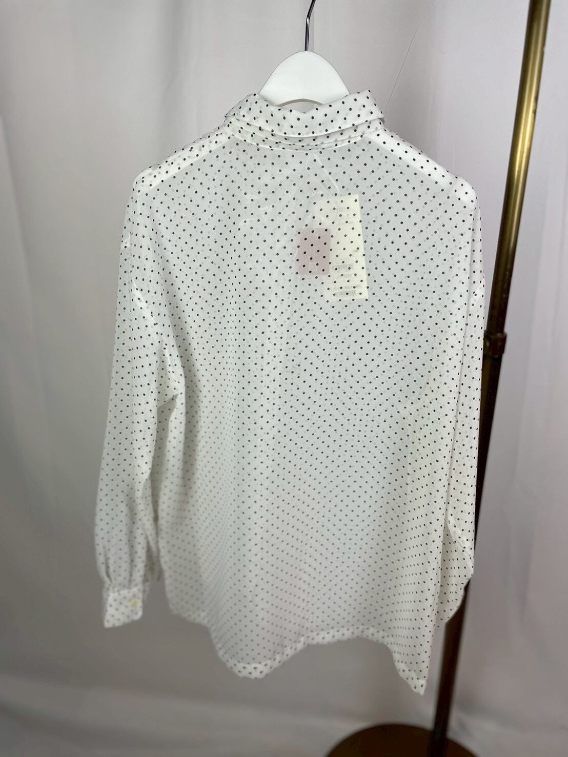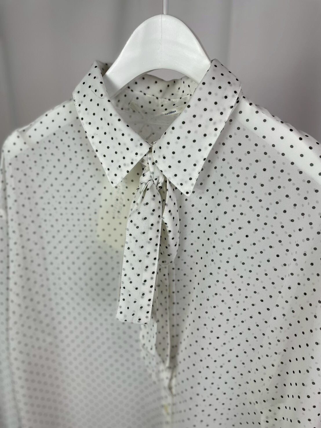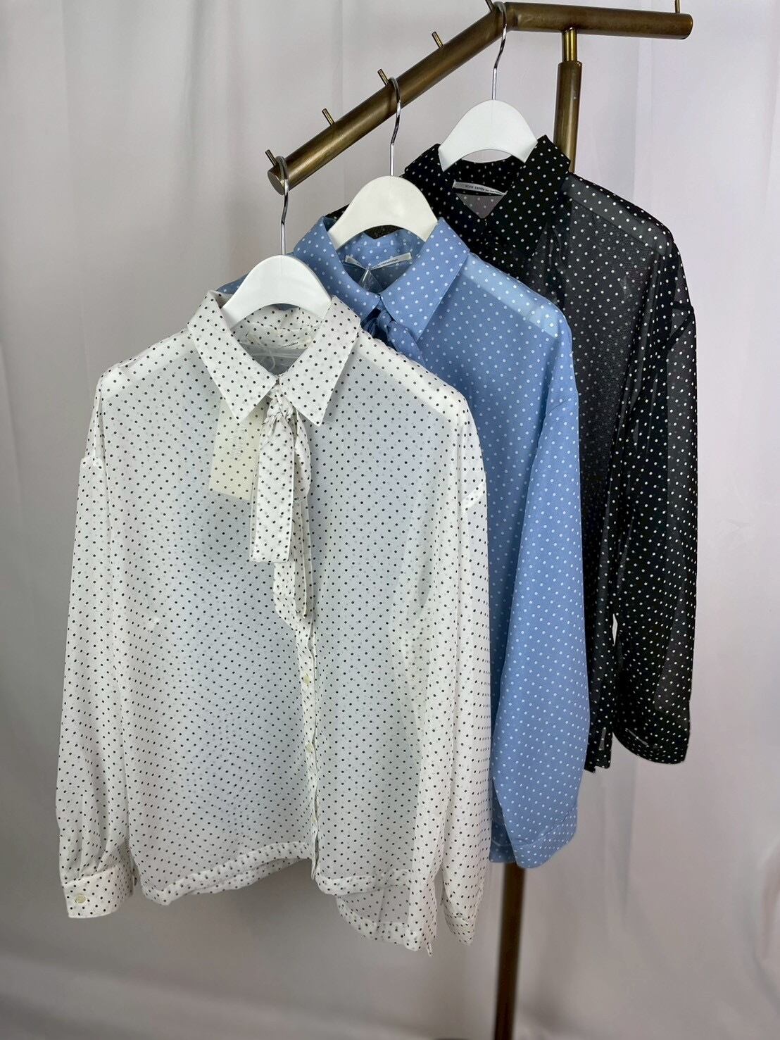 トレンドのドットが目を惹くボウタイシャツ。程よい透け感があり子供っぽくならない大人なデザイン。リボンは取り外し可能◎